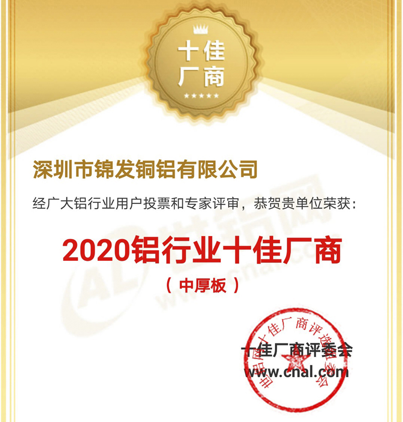 2020年4月份,世鋁網(wǎng)舉辦了“2020鋁行業(yè)十佳廠商評(píng)選”,在眾多專家、客戶和合作伙伴鼎力支持下,錦發(fā)銅鋁高票當(dāng)選“中厚板”類第一名! 這也是錦發(fā)銅鋁連續(xù)三年獲得榮譽(yù)!